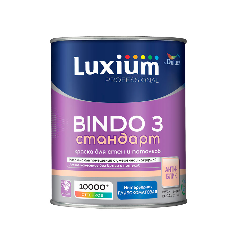 Глубокоматовая водно-дисперсионная краска Люксиум Профессионал Биндо 3 для высококачественной отделки стен и потолков в помещениях со стандартной нагрузкой, таких как спальни, гостиные, детские, кабинеты. Антибликовое покрытие отлично маскирует мелкие дефекты поверхности. Тиксотропная: наносится без брызг и потеков, легко разравнивается; с нейтральным запахом.