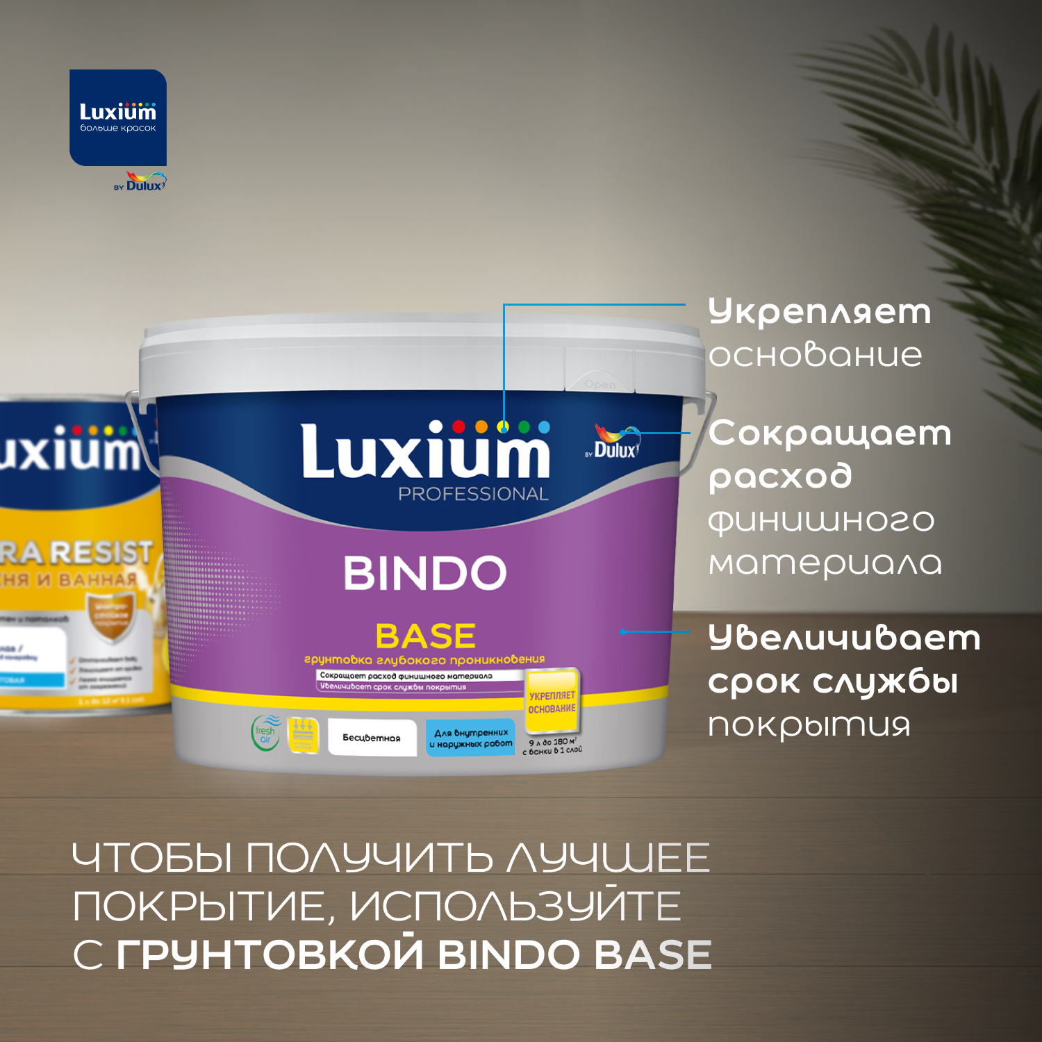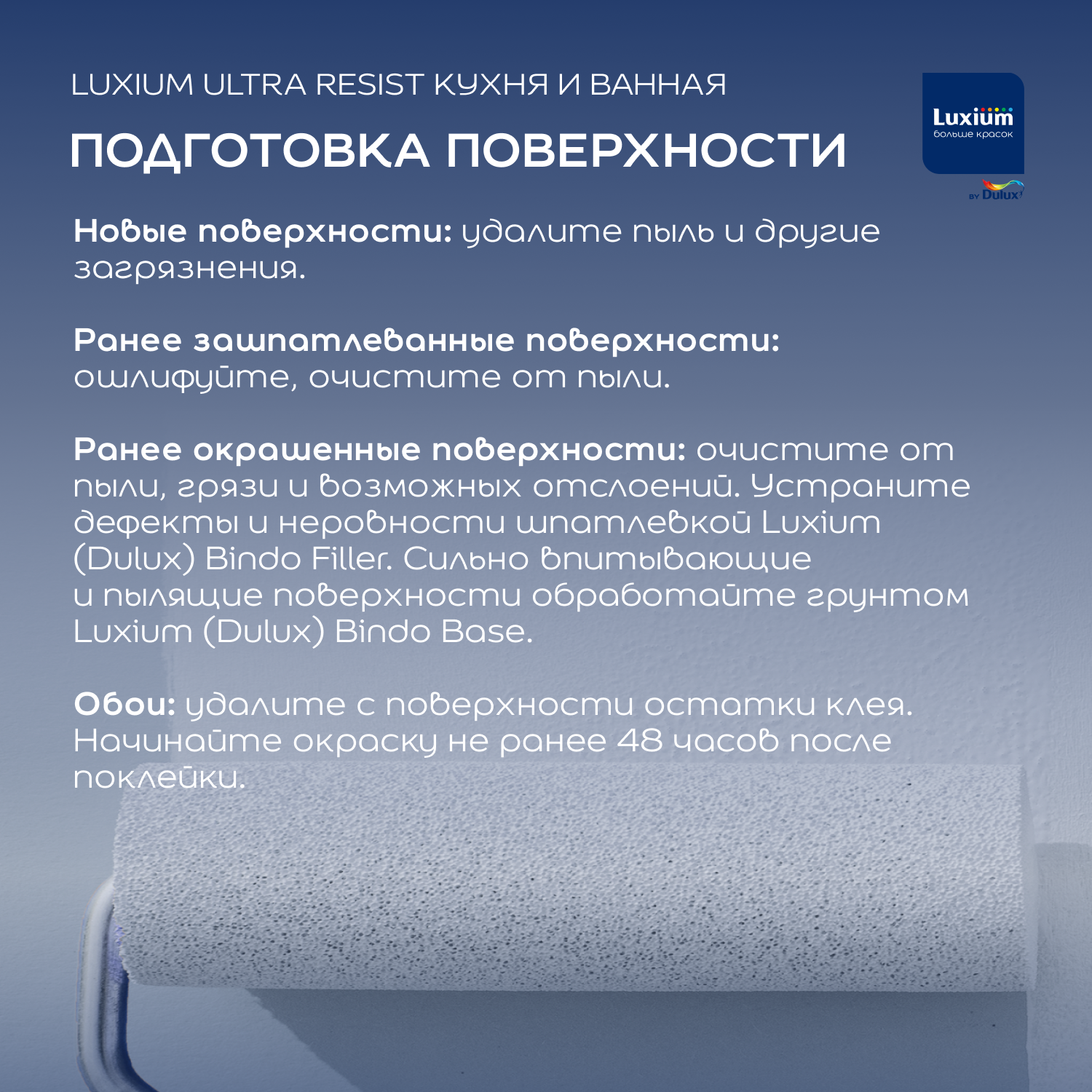 Перед применением тщательно перемешать. Для укрепления базовой поверхности, повышения адгезии и уменьшения расхода краски загрунтуйте подготовленную поверхность грунтовкой Luxium Bindo Base. Рекомендуется наносить в два слоя при температуре от +5 °C до +30°C, относительной влажности воздуха от 40 до 80%.
